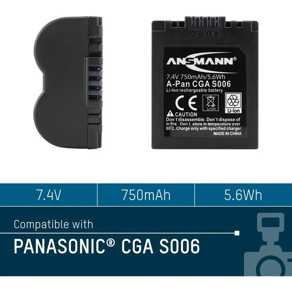 Der Digitalkamera-Akku Ansmann A-Pan CGA S006 ist ein Lithium-Ionen-Akku für das Kameramodell V-Lux 1 von Leica. Er hat eine Spannung von 7,4 Volt und eine Kapazität von 800 mAh.Art.-Nr.: 987394