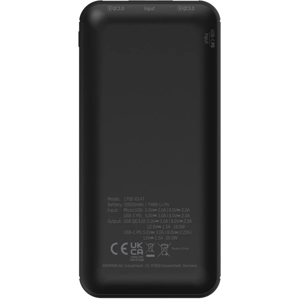 Die praktische Powerbank 20000mAh PB320PD von Ansmann kommt im eleganten Design, ist leicht, kraftvoll und kann immer mitgenommen werden. Die Powerbank besitzt einen USB-C Port mit Power Delivery Funktion (PD 3.0), über den man sogar Notebooks aufladen kann. Zum Aufladen der Powerbank selbst kann neben Micro USB auch der USB-C Port genutzt werden, egal ob am PC oder über ein handelsübliches Netzteil. Art.-Nr.: 1839939