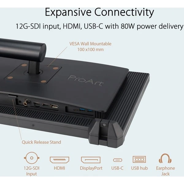Der ProArt PA24US ist ein hochwertiger LED-Monitor für professionelle Nutzer, die in den Bereichen Bereich Content Creation, Videobearbeitung und digitale Bildbearbeitung tätig sind. Der ProArt PA24US bietet auf einer Diagonale von 59,94 cm (23,6″) 4K UHD-Auflösung (3840 x 2160 Pixel) mit HDR10 und IPS-Technik. Das Display arbeitet mit 10-bit Farbtiefe bei Abdeckung von 95% DCI-P3 und 99% des Adobe-Farbraums. Dieser Monitor wird für höchste Farbtreue werkskalibriert ausgeliefert – hinzu kommt Selbstkalibrierung des Geräts über ein ins Gehäuse integriertes, einklappbares Farbmessgerät. Diese Funktion ist direkt über das Menü des Monitors zugänglich, arbeitet ohne zusätzliche Software und damit unabhängig vom Betriebssystem. Auch bei den Anschlüssen erfüllt der PA24US professionelle Ansprüche: Neben 2x HDMI und DisplayPort sowie 2x USB-A und USB-C mit 80 Watt Power Delivery ist ein 12G-SDI-Eingang vorhanden, der den direkten Anschluss einer SDI PCIe Capture Card ermöglicht – mit 4K-Qualität ohne Kompression und damit ohne Qualitätsverlust.Art.-Nr.: 100011345