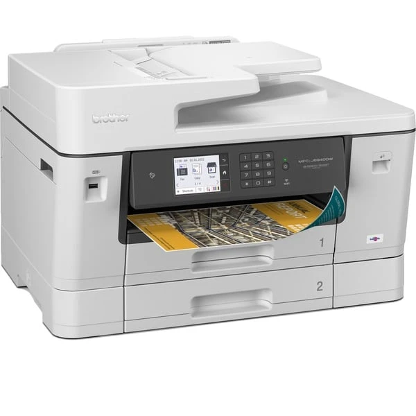 Der MFC-J6940DW liefert zuverlässige 4-in-1-Funktionalität für das Homeoffice oder kleine Büros. Dieser Multifunktionsdrucker arbeitet mit vier Tintenpatronen äußerst effizient und mit hohen Reichweiten, wobei er eine Geschwindigkeit von bis zu 35 Seiten Schwarzdruck und 32 Seiten Farbdruck erreicht. Neben der Druckfunktion bis zum Format DIN A3 sind ein Scanner mit Flachbetteinheit und 50 Blatt (DIN A3) fassendem Einzug sowie ein Kopierer an Bord. Der MFC-J6940DW verfügt über Schnittstellen für WLAN, LAN und USB – er unterstützt außerdem den Direktdruck von Mobilgeräten mit iOS oder Android. Durch die integrierte Faxschnittstelle wird dieses Gerät außerdem zur Faxzentrale. Dieses Multifunktionsgerät hat als Bedieneinheit an der Vorderseite einen Touchscreen, der mit Funktionstasten und einem Nummernblock kombiniert wurde. Das Gerät verfügt über zwei automatische Papierkassetten mit jeweils 250 Blatt Fassungsvermögen.Art.-Nr.: 1837326