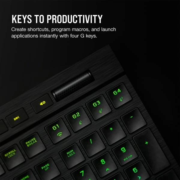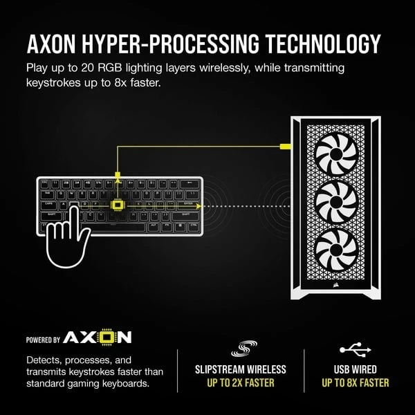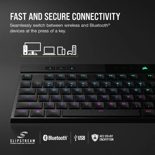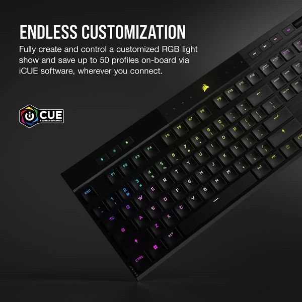 | Besonderheiten | Aluminiumrahmen mit gebürstetes Oberflächenfinish, ultradünnes Design, Konnektivität über superschnelles Sub-1-ms-SLIPSTREAM-Wireless oder latenzarmes Bluetooth 4.2 + LE, AES-128-bit-Verschlüsselung, Corsair AXON Hyper-Processing-Technologie, 4 Makrotasten, 5 dedizierte Multimedia-Hotkeys und 1 Lautstärkeregler, bis zu 50 Onboard-Profile, bis zu 20 benutzerdefinierte RGB-Beleuchtungsebenen | ||