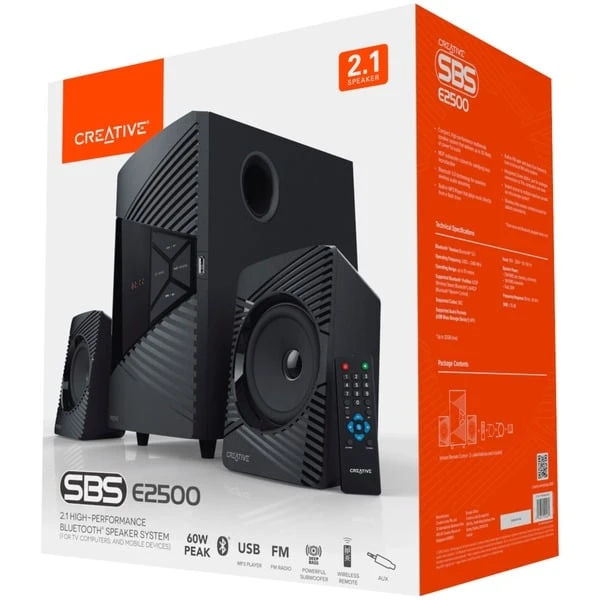 Der Creative SBS E2500 ist ein leistungsstarkes 2.1-Lautsprechersystem, dass durch eine Vielzahl von Anschlussoptionen einen satten und kräftigen Klang liefert. Man kann vollkommen kabellos über Bluetooth streamen, die eigenen Lieblings-UKW-Radiosender anhören oder Musik direkt