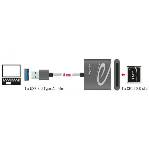 Dieser Card Reader von Delock kann zum Lesen und Beschreiben von CFast Speicherkarten verwendet werden. Über die USB Typ-A Schnittstelle wird der Card Reader an einen PC oder ein Notebook angeschlossen.