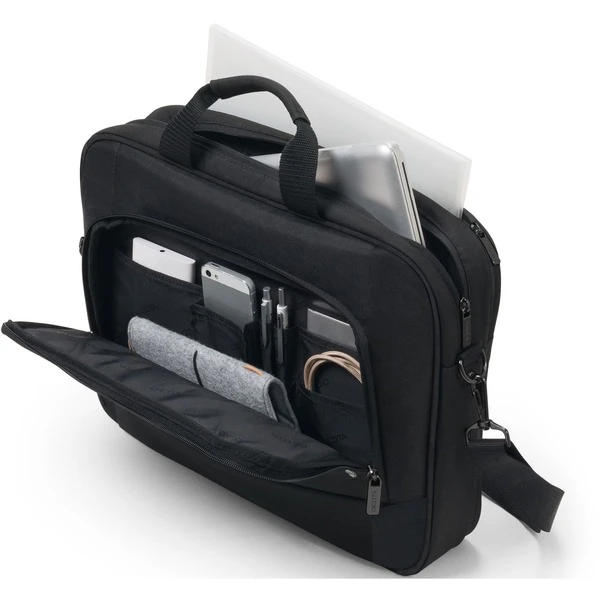 Die handliche Eco Traveller BASE Tasche schützt Notebooks mit einer Bildschirmdiagonalen zwischen 33 cm und 35,8 cm (13-14.1″) optimal dank dem mit High-Density Foam (HDF) gepolstertem Notebookfach. Zusätzliche Stabilität und Schutz wird durch den Metalldrahtrahmen gegeben. Als Leichtgewicht unter den Notebooktaschen ermöglicht sie flexible Mobilität. Im Dokumentenfach können Unterlagen einfach verstaut werden können. Im praktischen Vorderfach finden Sie genügend Platz für das Smartphone oder weiteres mobiles Zubehör wie Kabel, Stifte oder Ladegeräte, welche immer griffbereit sein sollen. Die Tasche liegt dank der mit Neopren gepolsterten Tragegriffe angenehm in der Hand und lässt sich im Handumdrehen mit einem integrierten Band am Trolley befestigen. Weiter kann die Tasche auch mit dem längenverstellbaren Schultergurt transportiert werden. Damit ist die Eco Traveller BASE die ideale Tasche für alle, die viel unterwegs sind und mit einer umweltfreundlichen Tragelösung die sinnvolle Wiederverwendung von PET Flaschen unterstützen möchten.Art.-Nr.: 1731620