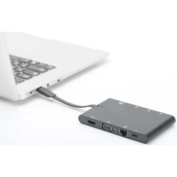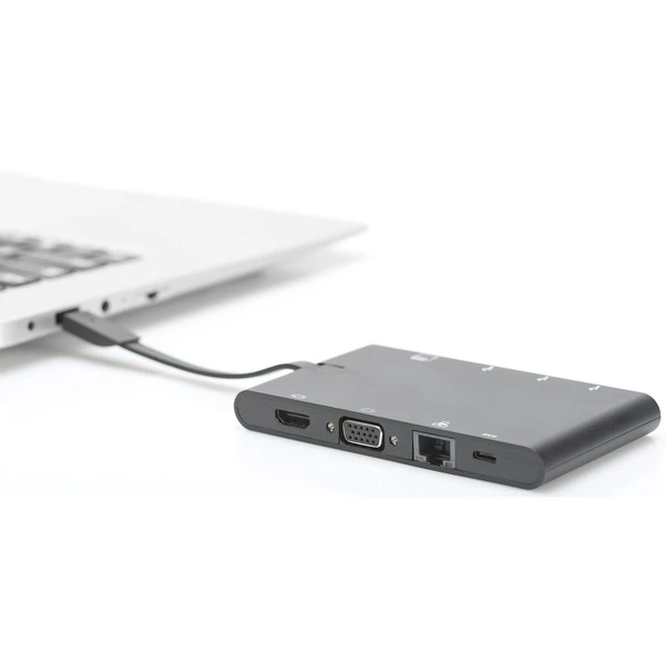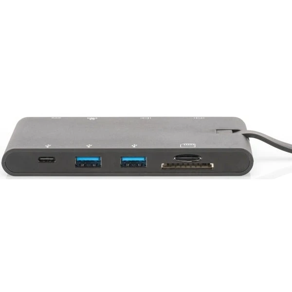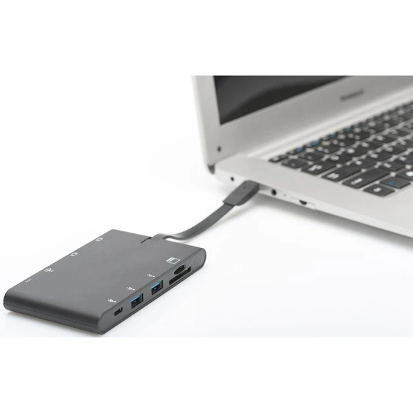 Die Universal Travel Docking Station kann dank der kompakten Maße und des verstaubaren USB-C Kabels schnell und überall mithin genommen werden. Entbehrt man einen USB-C Steckplatz, erhält man ganze neun Anschlüsse für Bildschirme, USB-Peripherie und Eingabegeräte sowie einen SD- und microSD Karten-Eingang. Über HDMI-Schnittstelle ist eine maximale Auflösung von 3.840 x 2.160 Pixel möglich. Einer der beiden USB-C Ports kann dank PD (Power Delivery-Funktion) auch mobile Endgeräte aufladen. Art.-Nr.: 1427928