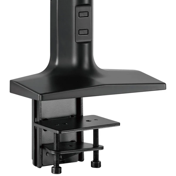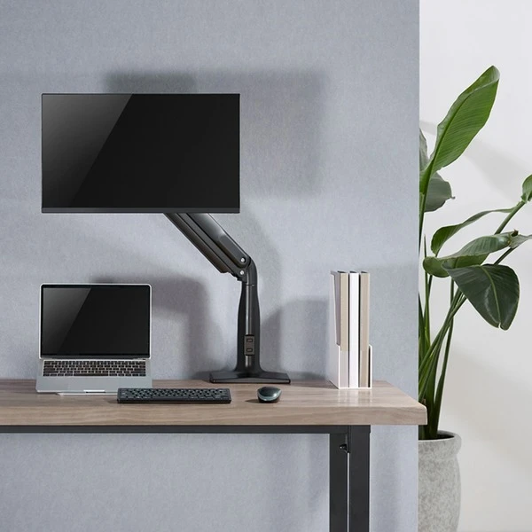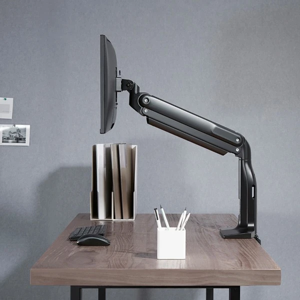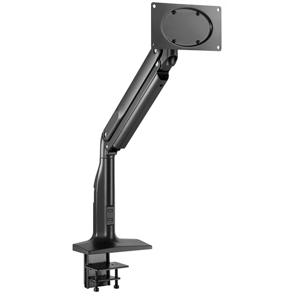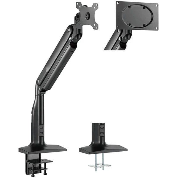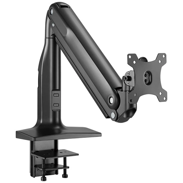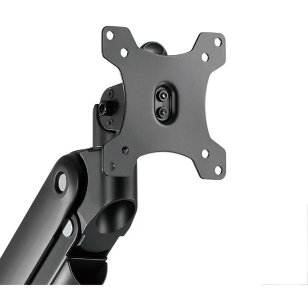 einen Monitor von 43 – 109 cm (17 – 43″) . Die Konstruktion ist aus hochwertigem, langlebigem Aluminium gefertigt. Durch extrem leichtgängige und auf das Gerätegewicht einstellbare Gasfederungen zudem vollbeweglich. Der Monitor lässt sich dadurch mühelos, nahezu schwebend, nur mit der Fingerspitze in jede gewünschte Position bringen. Der Neigungswinkel ist mit ± 45° variabel einstellbar. Zusätzlich ist eine stufenloser Wechsel der Bildschirmausrichtung möglich. Die VESA-Universalaufnahme kann mit 75 x 75 und 100 x 100 mm bestückt werden. Die Kabel der verbauten Komponenten können entlang der Schwenkarme verlegt und mit Clips sauber fixiert werden. Wahlweise ist eine Klemm- oder Schraubmontage