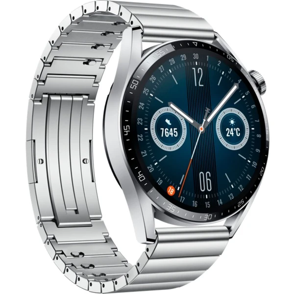 Elegant, stabil, leistungsfähig: Die Watch GT3 46mm (Jupiter B29T) von Huawei hat hat ein Ziffernblatt, das von gewölbtem 3D-Glas geschützt wird. Das Glas fängt das Licht ein und sorgt für einen wasserähnlichen Schimmer. Der moderne und stilvolle Look wird durch das minimalistische Gehäusedesign in Hochglanzoptik ergänzt, der mit raffinierten Armbändern – bei diesem Modell aus Edelstahl – komplettiert wird. Dabei ist das Gehäuse nur 11 mm dick und beherbergt ein 3,63 cm (1,43″) großes AMOLED-Display, dessen Ziffernblatt ganz nach persönlichen Vorlieben angepasst werden kann. Neben der Touchfunktionalität kann diese Smartwatch auch über die drehbare Krone bedient werden: Damit kann auch mit nassen Händen ein- und herausgezoomt oder zum Beispiel Lautstärke oder Alarmzeiten angepasst werden. Neben Benachrichtigungen von einem verbundenen Smartphone sind verschiedene Monitoring-Funktionen für Schlaf, Herzfrequenz, Stressabbau und Fitnesstraining an Bord. Dabei kann die Watch GT3 46mm (Jupiter B29T) auch Anrufe von einem verbundenen Smartphone annehmen. In Kombination mit dem leistungsfähigen Akku, der bis zu 14 Tage durchhält und kabellos geladen werden kann ist die Watch GT3 46mm (Jupiter B29T) ein zuverlässiger und stabiler Alltagsbegleiter, dessen Gehäuse zudem bis zu einer Tiefe von 50 Metern wasserfest ist.Art.-Nr.: 100010644