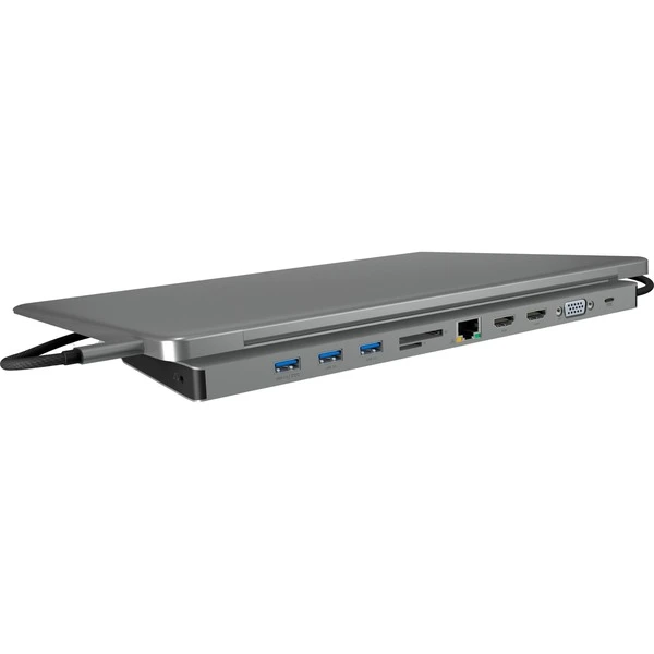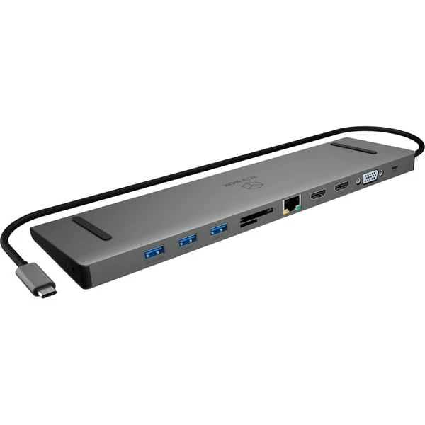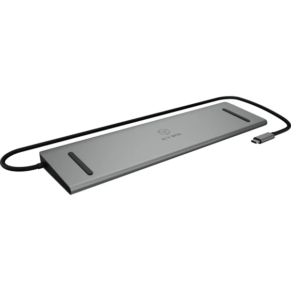 Die IB-DK2106-C Dockingstation eignet sich für Notebooks mit MacOS oder Windows und wird super einfach per USB-C mit diesen verbunden. Dank USB-C Power Delivery können die angeschlossenen Endgeräte mit bis zu 100 Watt Stromleistung gleichzeitig aufgeladen werden. Die Dockingstation verfügt über drei Videoausgänge: Zwei HDMI-Ports mit Unterstützung bis 4K @ 30 Hz (3.840 x 2.160 Pixel) sowie ein VGA-Ausgang mit bis WUXGA-Support (1.920 x 1.200 @ 30 Hz). Drei USB-A 3.2 Ports mit max. 5 Gbit/s Übertragungsgeschwindigkeit sowie ein 3,5 mm Kombistecker für Kopfhörer oder Mikrofone befinden sich auf der Rückseite. Abgerundet wird die Dockingstation von einem LAN-Port und einem SD- sowie MicroSD Kartenleser (bis max. UHS-I). Durch die Bauform der Dockingstation wird das Notebook leicht angehoben, was die Luftzirkulation fördert und damit die Kühlung des Notebooks optimiert.Art.-Nr.: 1580480