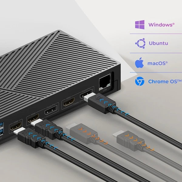 | Hinweis | Windows / macOS / Chrome OS / Ubuntu (Linux), mit installiertem DisplayLink Treiber – USB Type-A, USB Type-C, Thunderbolt 3/4 Type-C Power Delivery und DP Alt Mode nur über Type-C Hostcomputer mit Power Delivery und DP Alt Mode Unterstützung. | ||
