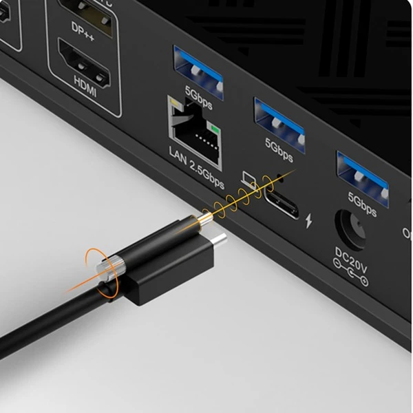 | Anschlüsse | 4x DisplayPort-Ausgang, 4x HDMI-Ausgang, 1x Kopfhörer/Mikrofon-Kombi-Anschluss, 1x RJ-45, 3x USB-A 3.2 Gen 1 (5 Gbit/s), 1x USB-A 3.2 Gen 2 (10 Gbit/s), 1x USB-C 3.2 Gen 1 (5 Gbit/s) | ||