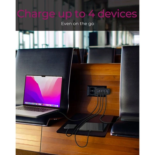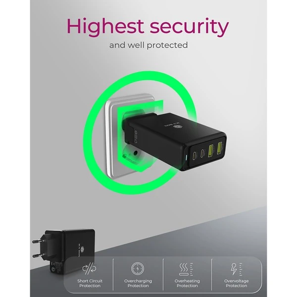 | Feature | Energieeffizientes Power Delivery GaN 3.0 Ladegerät, 2x USB Type-C mit Power Delivery 3.0, 2x USB Type-A mit Quick Charge 3.0, LED für Betrieb | ||
