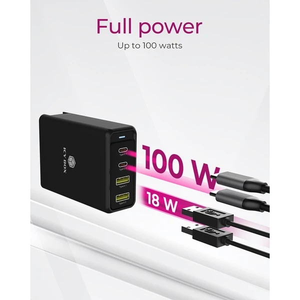 Das ICY BOX IB-PS104-PD ist ein 4-Port Wall Charger mit Power Delivery 3.0 und GaN Unterstützung. Die vier Schnittstellen eignen sich für Notebooks und mobile Geräte. Mit bis zu 100 W Power Delivery 3.0 kann es Notebooks, Smartphones und Tablets laden. Es stehen zwei USB Type-C sowie zwei USB Type-A Anschlüsse zur Verfügung. Nicht nur das kompakte Design ist perfekt für den Einsatz unterwegs, der zusätzliche UK Adapter sorgt für Flexibilität auf Reisen.Art.-Nr.: 1828511