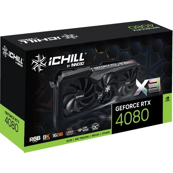 Die INNO3D GeForce RTX 4080 ICHILL X3 ist eine High-End-Grafikkarte mit der GeForce RTX 4080 GPU von NVIDIA. Die leistungsfähigen GeForce RTX 40-Grafikkartenserie basiert auf der NVIDIA Ada Architektur und bietet neue Stufen von Gaming Realismus, Geschwindigkeit und Leistungseffizienz, RTX IO und realistische VR-Erlebnisse. Weitere Features sind Real-Time Ray Tracing, NVIDIA Ansel, mit umfangreichen Werkzeugen zur Erstellung von Screenshots in Spielen sowie NVIDIA G-SYNC, G-SYNC HDR, DirectX 12 Ultimate, NVIDIA DLSS 3.0, PCI Express Gen 4, NVIDIA FreeStyle, NVIDIA ShadowPlay, NVIDIA Highlights, NVENC Gen 8, AV1 Encoder, Vulkan RT API und OpenGL 4.6. Die auf der INNO3D GeForce RTX 4080 ICHILL X3 verbaute GPU verfügt über 9728 CUDA Cores. Der 16 Gbyte große GDDR6X-Speicher verfügt über einen 256-Bit-Speicherkontroller und ist mit einer Bandbreite von 716.8 GB/Sek angebunden.Art.-Nr.: 1878046