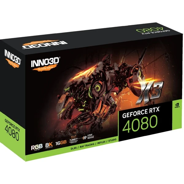 Die INNO3D GeForce RTX 4080 X3 ist eine High-End-Grafikkarte mit der GeForce RTX 4080 GPU von NVIDIA. Die leistungsfähigen GeForce RTX 40-Grafikkartenserie basiert auf der NVIDIA Ada Architektur und bietet neue Stufen von Gaming Realismus, Geschwindigkeit und Leistungseffizienz, RTX IO und realistische VR-Erlebnisse. Weitere Features sind Real-Time Ray Tracing, NVIDIA Ansel, mit umfangreichen Werkzeugen zur Erstellung von Screenshots in Spielen sowie NVIDIA G-SYNC, G-SYNC HDR, DirectX 12 Ultimate, NVIDIA DLSS 3.0, PCI Express Gen 4, NVIDIA FreeStyle, NVIDIA ShadowPlay, NVIDIA Highlights, NVENC Gen 8, AV1 Encoder, Vulkan RT API und OpenGL 4.6. Die auf der INNO3D GeForce RTX 4080 X3 verbaute GPU verfügt über 9728 CUDA Cores. Der 16 Gbyte große GDDR6X-Speicher verfügt über einen 256-Bit-Speicherkontroller und ist mit einer Bandbreite von 716.8 GB/Sek angebunden.Art.-Nr.: 1878001