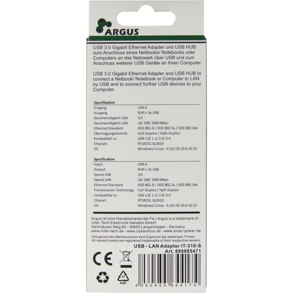 Der ARGUS IT-310-S LAN-Adapter schafft eine Verbindung zwischen Ihrem Netzwerk und einer freien USB 3.0-Schnittstelle Ihres Notebooks/Computers. Neben dem sofort einsatzbereiten RJ45-Netzwerkanschluss bietet der IT-310-S zudem noch einen dreifach USB 3.0 USB-Hub. Das Gehäuse besteht aus Aluminium und setzt mit seiner silbernen Lackierung und polierten Kanten auch optische Akzente.Art.-Nr.: 1880030