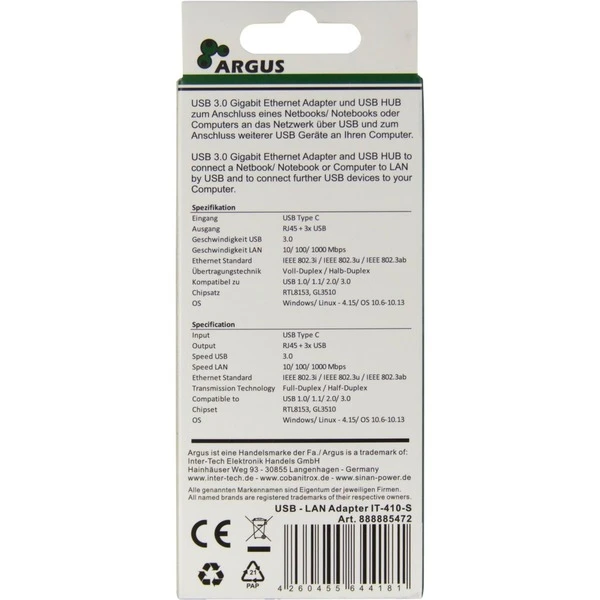 Der ARGUS IT-410-S LAN-Adapter schafft eine Verbindung zwischen Ihrem Netzwerk und einer freien USB Type C-Schnittstelle Ihres Notebooks/Computers. Neben dem sofort einsatzbereiten RJ45-Netzwerkanschluss bietet der IT-410-S zudem noch einen dreifach USB 3.0 USB-Hub. Das Gehäuse besteht aus Aluminium und setzt mit seiner silbernen Lackierung und polierten Kanten auch optische Akzente.Art.-Nr.: 1880031
