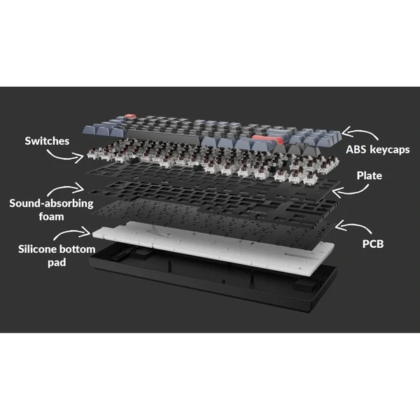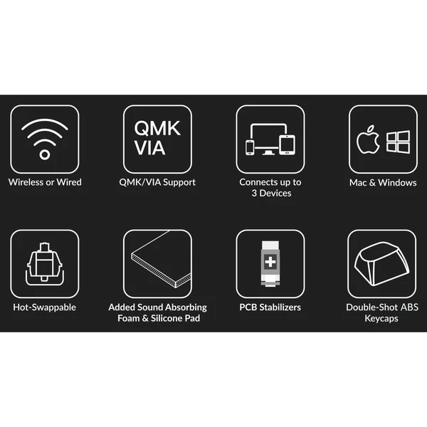 | Besonderheiten | Nach Süden ausgerichtete RGB-Hintergrundbeleuchtung mit 19 Beleuchtungsmodi | Verbindung mit bis zu 3 Geräten | ABS-Tastenkappen | Eingeschraubte PCB-Stabilisatoren| Vollständige QMK- und VIA-Unterstützung | OSA-Tastenkappen-Profil (OEM-Profil mit sphärischem Winkel) | Tippwinkel: 0º, 6º und 9º | Aluminiumrahmen | ||