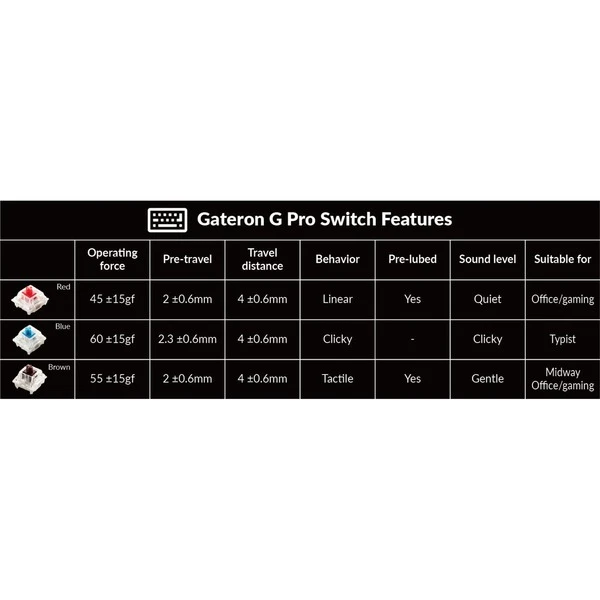 | Hinweis | Der Sockel von Gateron (Hot-Swap-fähig) ist kompatibel mit fast mechanischen Schaltern im MX-Stil mit 3 und 5 Pins auf dem Markt kompatibel (einschließlich Gateron, Cherry, Kailh, etc.). | ||