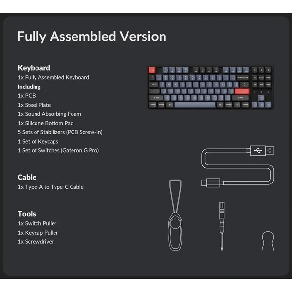 | Weitere Informationen | Vollständig montierte Tastatur inkl. Aluminiumrahmen, PCB, Stahlplatte, schalldämmender Schaumstoff, Silikon-Bodenpolster, 5 Sets an Stabilisatoren (eingeschraubt), 1 Set an ABS-Tastenkappen, 1 Set an Gateron G Pro Schaltern | Wiederaufladbare 4000 mAh Li-Polymer-Batterie | Akkulaufzeit: Bis zu 300 Stunden bei ausgeschalteter Hintergrundbeleuchtung, bis zu 100 Stunden bei eingeschalteter Hintergrundbeleuchtung | Bluetooth-Version: 5.1 | ||