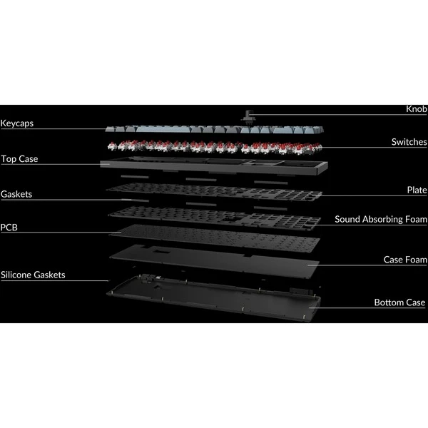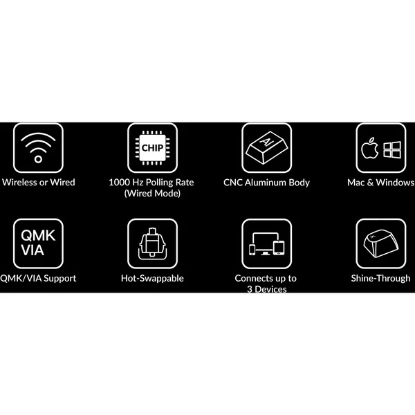 | Besonderheiten | Aluminiumrahmen (6063 Aluminium, CNC-gefräst, poliert, eloxiert, sandgestrahlt) | durchscheinende ABS-Tastenkappen mit OSA-Profil (OEM-Profil mit sphärischem Winkel) | Programmierbarer Drehregler | Zusätzliche anpassbare Tasten auf der linken Seite | Nach Süden ausgerichtete RGB-LEDs | Eingeschraubte PCB-Stabilisatoren | Vollständige QMK- und VIA-Unterstützung | macOS-Windows-Umschalter | ||