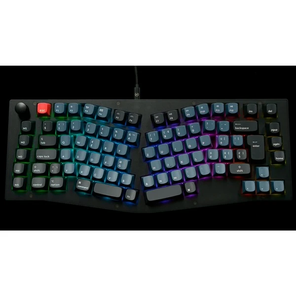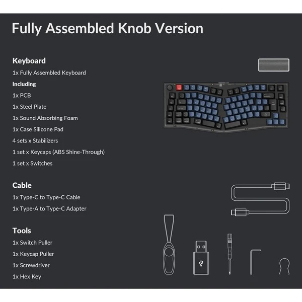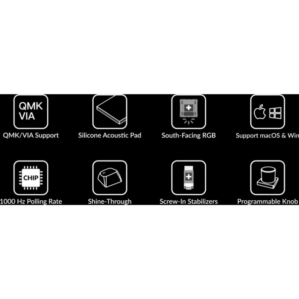 | Besonderheiten | Ergonomisches Alice-Layout | ABS-Rahmen | Durchscheinende ABS-Tastenkappen mit OSA-Profil (OEM-Höhe, SA-Form) | Nach Süden ausgerichtete RGB-LEDs | Tray-Mount Design | Eingeschraubte PCB-Stabilisatoren | Vollständige QMK- und VIA-Unterstützung | macOS-Windows-Umschalter | Neigungswinkel: 3,5° / 6,7° / 9,3° | ||