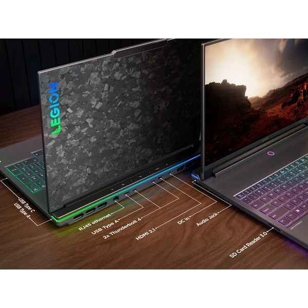 Das Lenovo Legion 9 16IRX8 (83AG0009GE) Gaming-Notebook setzt auf Intels neuen Hybridprozessor Intel® Core™ i9-13980HX mit 8 Performance und 16 Efficiency Kernen. Dem Prozessor stehen 64 Gigabyte DDR5-Arbeitsspeicher und eine per PCIe 4.0 angebundene SSD mit einer Kapazität von 2 Terabyte zur Seite. Das 40,6 cm (16“) große, 1200 nits helle Mini-LED-Display bietet eine Auflösung von 3200×2000 Pixeln bei einer Wiederholungsrate von 165 Hz und wird von einer NVIDIA GeForce RTX 4090 mit 16 Gigabyte GDDR6-Videospeicher angesteuert. Dank seiner üppigen Schnittstellenausstattung mit zwei USB-A-, einem USB-C- und zwei Thunderbolt-4-Anschlüssen sowie HDMI 2.1 lässt sich das Legion 9 mit weiteren Bildschirmen und Peripherie verbinden. Mit Gigabit-LAN, Wi-Fi 6E (802.11ax) und Bluetooth 5.3 stehen zudem verschiedene Vernetzungsoptionen bereit.Art.-Nr.: 100008792