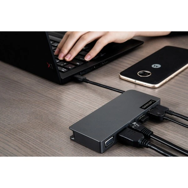 Das Powered USB-C Travel Hub von Lenovo eignet sich für sämtliche Notebooks und wird über USB-C mit diesen verbunden. Das Powered USB-C Travel Hub besitzt einen weiteren USB-C Port mit PD (Power Delivery) Funktion, wodurch die angeschlossenen Geräte mit bis zu 65 Watt Strom aufgeladen werden können. Über HDMI und VGA können Monitore mit max. 4K @ 60 Hz (HDMI) oder FullHD @ 60 Hz (VGA) betrieben werden. Weitere Anschlüsse bestehen aus einem USB-A 2.0 und 3.2 (5 Gbit/s) Port sowie einem RJ-45 Anschluss für eine stabile Netzwerkverbindung. Art.-Nr.: 1583108