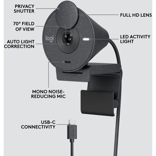 Mit der Logitech Brio 300 zeigt man sich selbstbewusst in jedem Videogespräch und verschafft sich Gehör. Die Brio 300 zeigt jeden im besten Licht mit hoher Auflösung und automatischer Belichtungskorrektur. Die benutzerfreundliche Abdeckblende schafft Privatsphäre durch einfaches Drehen. Die Brio 300 funktioniert mit führenden Meeting-Plattformen und verfügt über ein elegantes, gesprenkeltes Design mit 62% recyceltem Kunststoff.Art.-Nr.: 1891906