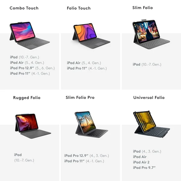 | Besonderheiten | 3 Modi (Tippen, Zeichnen, Lesen) | Vollständige Tastenzeile mit iPadOS-Sondertasten | 18 mm Tastenabstand | Fixierter Ansichtswinkel: Tipp-Modus 58°, Anzeige-Modus 10° | Wasserabweisender, leicht zu reinigender, strapazierfähiger Kunststoff | Zugriff auf alle Anschlüsse | Aufbewahrungsmöglichkeit für Logitech Crayon oder Apple Pencil | ||