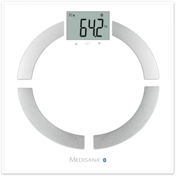 Die Körperanalysewaage Medisana BS 444 connect misst nicht nur das Gewicht mit einer Genauigkeit von 100 Gramm, sie gibt auch den Anteil von Körperfett, Körperwasser sowie Muskelmasse und Knochengewicht in Prozent der Gesamtmasse aus. So lässt sich feststellen, ob die zugenommenen Kilos vom Joggen (Muskelmasse) oder vom Schlemmen (Körperfett) kommen. Ermittlung des BMI Wertes und eine Kalorienbedarfsanalyse unterstützen den Weg zum Zielgewicht. Die Medisana BS 444 connect besitzt einen Wägebereich bis zu 180 kg und hat einen Speicher für bis zu 8 Personen. Über die separate VitaDock-App lassen sich zusätzliche Funktionen über Bluetooth auf einem Smartphone oder Tablet einstellen.Art.-Nr.: 1355356