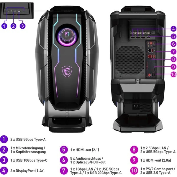 Der MEG Aegis Ti5 13NUG-292AT von MSI hebt sich mit seinem futuristischen Design von anderen Gaming-PCs optisch ab. Dieser Gaming-Desktop ist zudem exklusiv mit dem HMI 2.0 (Human Machine Interface) Touchdisplay ausgestattet, über das sich der Systemstatus sehen, die Leistung einstellen und die Gaming Intelligence Funktion von MSI Gaming-Monitoren steuern lässt. Ausgestattet ist der MEG Aegis Ti5 13th mit einem leistungsstarken Intel® Core™ i9-13900KF Prozessor, der zusammen mit 64 GB DDR5-Arbeitsspeicher und einer 1 TB großen M.2-PCIe-SSD rasantes Gaming ermöglicht. Eine 2 TB große SATA-HDD bietet zusätzlichen Speicherplatz. Für entsprechend beeindruckende Grafikdarstellungen ist eine NVIDIA GeForce RTX 4080 mit 16 GB GDDR6X-Videospeicher verbaut. 1- und 2,5-Gigabit-LAN ermöglichen Online-Gaming ohne Verzögerungen und für kabelloses Spielen mit kabelgebundener Qualität stellt der MEG Aegis Ti5 13th WLAN bis zum Standard WiFi 6E zur Verfügung. Darüber hinaus bietet dieser Gaming-PC umfassende Anschlussmöglichkeiten für Monitore und weitere Peripherie und besitzt dank Silent Storm Cooling 3 sowie einer AIO-Wasserkühlung für die CPU eine optimale Kühlleistung.Art.-Nr.: 1914918