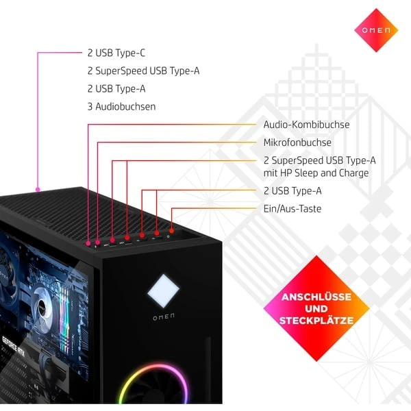 Der OMEN 40L Gaming-Desktop GT21-0023ng ist der ideale Begleiter in allen Spielen. Neben einem leistungsstarken AMD Ryzen 9 5900X Achtkern-Prozessor und einer NVIDIA GeForce RTX 3070 Grafikkarte mit 8 Gigabyte GDDR6-Grafikspeicher verfügt der OMEN 40L Desktop über ein erstklassiges Kühlsystem, das ein Überhitzen des PCs verhindert. Eine 512 Gigabyte große M.2 PCIe-SSDs und 16 Gigabyte DDR4-Arbeitsspeicher sorgen zusätzlich für hohe Effizienz und Reaktionsfähigkeit und eine 1 Terrabyte große SATA-HDD bietet jede Menge Platz zum Speichern von Daten. Über Gigabit-LAN sowie WLAN bis Standard Wi-Fi 6 (802.11ax) ist dieser PC netzwerkfähig. Dank müheloser Upgradefähigkeit ganz ohne Werkzeug liefert der OMEN 40L Desktop die ideale Leistung für alle Gaming-Bedürfnisse.Art.-Nr.: 1859990