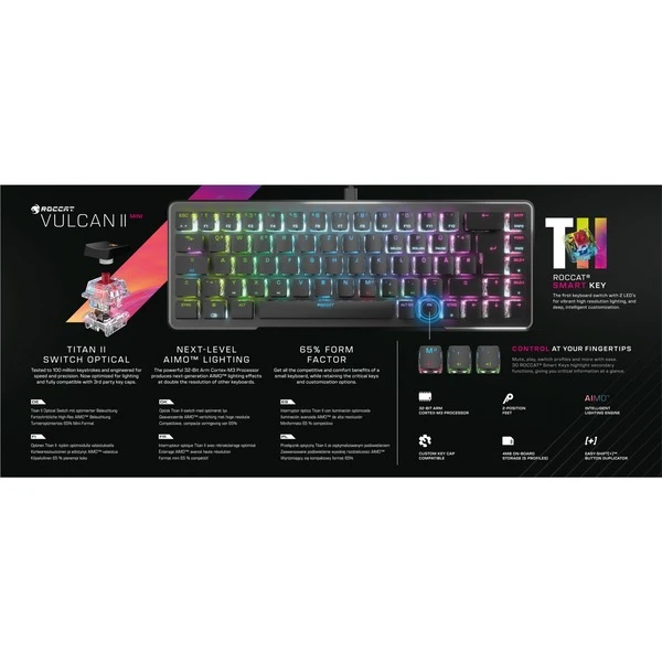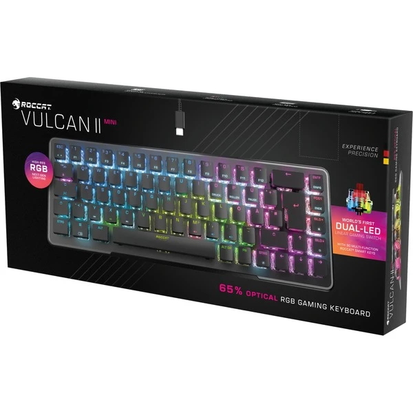 Die optisch-mechanische Roccat Vulcan II Mini Gaming-Tastatur kombiniert Performance und Funktionalität in einem minimalistischen Formfaktor. Mit 65 % der Größe einer Standard-Tastatur lässt sie jede Menge Platz für große Mauspads sowie ausholende Mausbewegungen in reaktionsschnellen Spielen und behält dabei die Pfeiltasten-Funktionalität, was ideal für die Ausstattung jedes Gaming-Enthusiasten macht. Die exklusiven Roccat Titan II Optical Switches verfügen über eine ultraschnelle lineare Auslösung und sind unglaublich strapazierfähig, mit einer Tastendruck-Lebensdauer von 100 Millionen für einen echten Wettbewerbsvorteil in jedem Spiel. Sie sind zudem kompatibel mit vielen Drittanbieter-Tastenkappen mit kreuzförmigem Befestigungsaufsatz, damit man den Look der Vulcan II Mini ganz individuell anpassen kann. Im Spielmodus hat man Zugriff auf die Easy-Shift [+] Tasten-Duplizierungstechnologie, welche Tasten-Zweitfunktionen ermöglicht, wodurch sich nahezu unbegrenzte Tasten-Programmierungsmöglichkeiten ergeben. Man weiß immer genau, welche Tastenbefehle man eingibt, dank der 30 multifunktionalen Smart-Tasten mit einer Doppel-LED, die anzeigt, wenn die Zweitfunktion aktiv ist. Das USB-C-Kabel lässt sich ganz einfach abnehmen und es können bis zu 5 Profile mit individuell angepassten Einstellungen für Beleuchtung, Tastenzuweisungen und mehr direkt auf der Tastatur gespeichert und überallhin mit hingenommen werden. Die Vulcan II Mini verfügt über eine Außenhülle aus eloxiertem Aluminium, die ihre strukturelle Integrität verstärkt, und ist kompatibel mit Roccats AIMO-Beleuchtungstechnologie, die ohne weitere Konfiguration fantastische RGB-Leuchteffekte erzeugen und mit anderen kompatiblen AIMO-fähigen Produkten für ein unglaublich immersives Lichtspektakel synchronisiert werden kann.Art.-Nr.: 1875212
