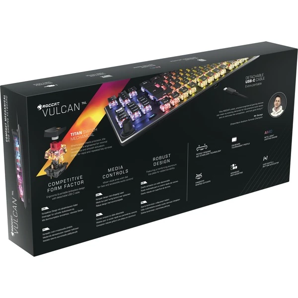 Die von Kritikern gefeierte Vulcan wird im kleineren Tenkeyless-Format zur Vulcan TKL. Das Design schafft mehr Platz auf dem Schreibtisch für mehr Reichweite mit der Maus und ermöglicht eine natürlichere Haltung der Hände beim Spielen. Der Titan Switch Mechanical bietet den Spielern mit seinem sanften Betätigungsabstand von 1,4 mm die branchenweit beste Mischung aus Geschwindigkeit und Reaktionsfähigkeit. Die Vulcan TKL verfügt außerdem über eine lebendige AIMO-Beleuchtung, ein ergonomisches flaches Design und Mediensteuerung im Mixer-Stil.Art.-Nr.: 1671179
