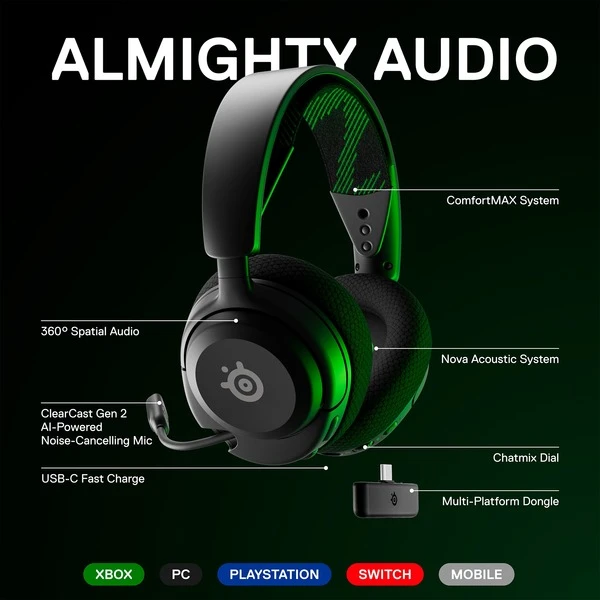 Mit dem SteelSeries Arctis Nova 4X Gaming-Headset lässt man Standard-Audio hinter sich und taucht ein in die Welt von Almighty Audio: Eine perfekte Symbiose aus SteelSeries-Hardware und der Sonar-Software als Teil des Nova-Audiosystems. Die eigens für das Arctis Nova hergestellten Treiber sorgen für hochwertiges Audio, kristallklare Bässe und hochauflösenden In-Game-Sound der Spitzenklasse. Die Sonar Audio Software Suite ergänzt die Hardware perfekt und eröffnet völlig neue Möglichkeiten zur individuellen Anpassung des Sounds dank parametrischem 10-Band-Equalizer. Das einziehbare ClearCast Gen 2 Mikrofon blendet Umgebungsgeräusche mithilfe der leistungsstarken KI-Algorithmen der Sonar-Software aus, um die Sprachübertragung zu optimieren. Die innovative Wireless-Technologie Quantum 2.0 des Arctis Nova 4X sorgt für extrem niedrige Latenzen mit 2,4 GHz über einen Mini-USB-C-Dongle. Es lässt sich zudem dank Plug&Play einfach mit der bevorzugten Plattform verbinden – darunter PC, Mac, PlayStation 5, Switch, Meta Quest 2, Steam Deck sowie USB-C-Mobilgeräte und -Tablets. Mit 36 Stunden Akkulaufzeit kann man über 1,5 Tage lang spielen und in nur 15 Minuten Ladezeit über USB-C 6 Stunden Spielvergnügen genießen. Das Comfortmax-System des Arctis Nova 4X besteht aus höhenverstellbaren, drehbaren Ohrmuscheln mit einem AirWeave Memory Foam Ohrpolster sowie einem flexiblen Kopfriemen. Darüber hinaus lässt sich über die Bedienelemente des Headsets die Lautstärke blitzschnell mit einem Schieberegler einstellen oder das Mikrofon mit einer Taste stummschalten.Art.-Nr.: 1915657